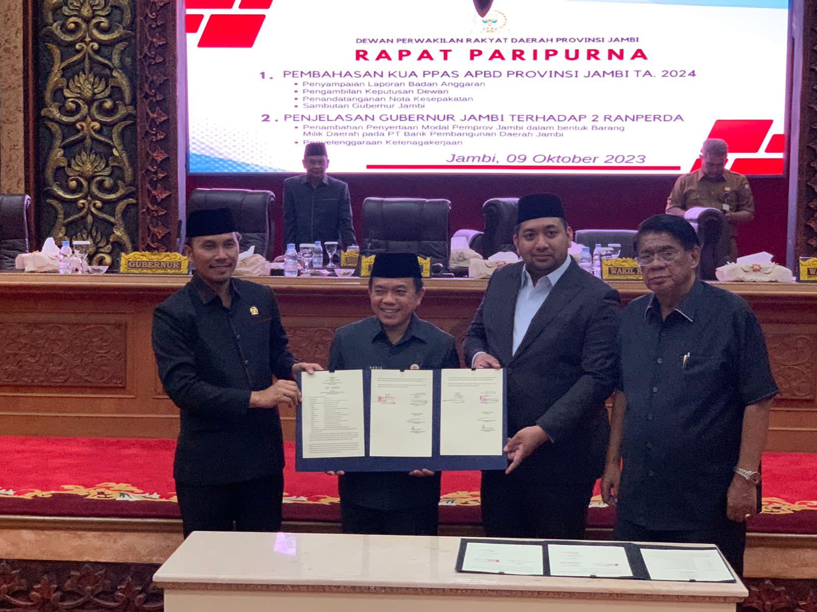 Pada kesempatan ini, turut dilakukan penandatangan antara DPRD Provinsi Jambi dalam hal ini pimpinan DPRD Provinsi Jambi bersama dengan Pemerintah Provinsi Jambi dalam hal ini Gubernur Jambi.