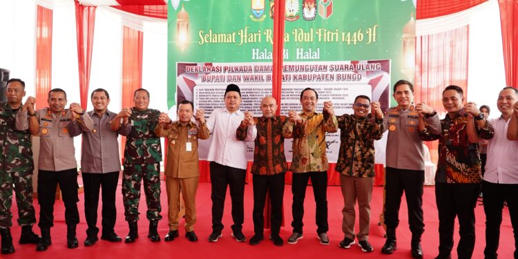 JEKA24.COM | BUNGO – Gubernur Jambi Dr. H. Al Haris, S.Sos, MH menghadiri Deklarasi Pemungutan Suara Ulang (PSU) Pilkada Damai Kabupaten Bungo, bertempat di Kapolres Bungo, Jum’at (04/04/2025).