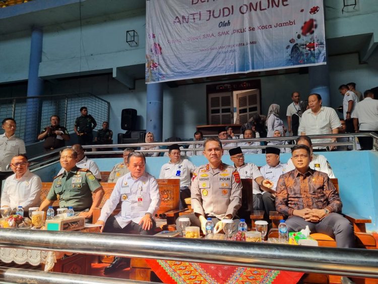 JEKA24.COM | JAMBI – Kapolda Jambi Irjen Pol Krisno H. Siregar S.I.K.,M.H, bersama Gubernur Jambi, dan Unsur Forkompimda Provinsi Jambi menghadiri Deklarasi Anti Judi Online, yang diprakarsasi oleh Siswa siswi SMA, SMK dan PKLK se Kota Jambi, di Gor Kota Baru, Rabu (16/4/25).