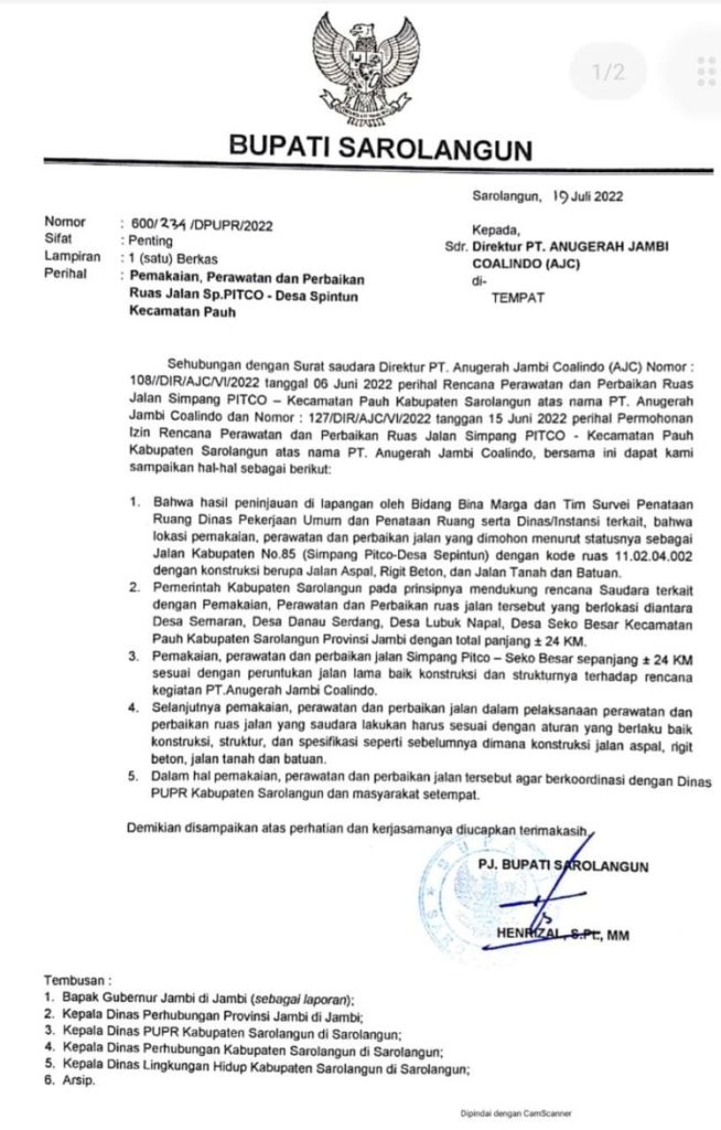 Menurut Yudha, izin penggunaan jalan untuk PT AJC ini diterbitkan Pj Bupati Sarolangun Hendrizal pada 19 Juli 2022. Izin tersebut berdasarkan surat berkop Bupati Sarolangun dengan nomor 600/234/DPUPR/2022.