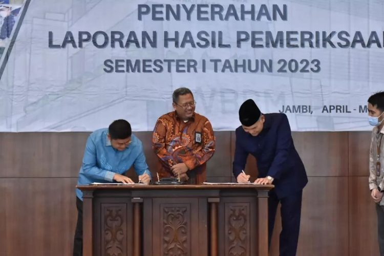 JEKA24.ID | JAMBI – Ketua DPRD kota Jambi bapak Putra Absor Hasibuan, SH bersama Walikota Jambi bapak Dr.H.Syarif Fasha, ME menerima Penyerahan Laporan Hasil Pemeriksaan atas Laporan Keuangan Pemerintah Daerah Semester 1 tahun anggaran 2022. Selasa (18/4/2023).