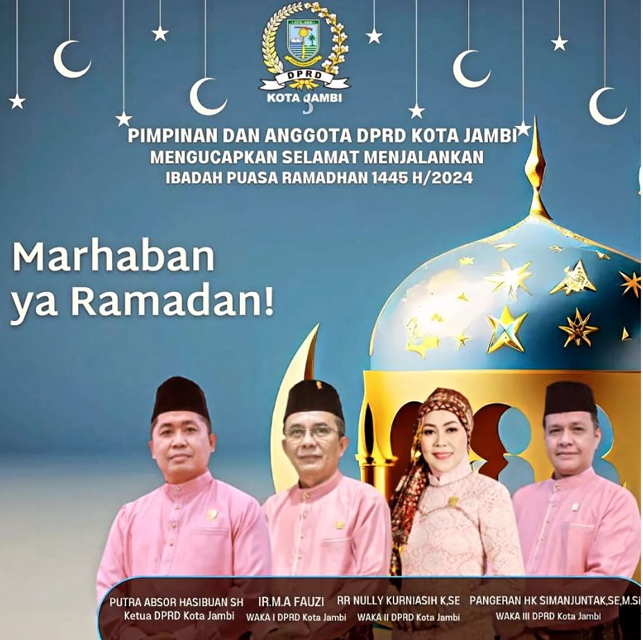 JEKA24.COM | JAMBI – Memasuki bulan suci ramadhan 1445 Hijriyah segenap pimpinan Dewan Perwakilan Rakyat Daerah (DPRD) Kota Jambi yang di antaranya Ketua DPRD Kota Jambi Putra Absor Hasibuan, Wakil Ketua I DPRD Kota Jambi M. A Fauzi, Wakil Ketua II RR Nully Kurniasih, dan Wakil Ketua III Pangeran HK Simanjutak mengucapkan selamat menjalankan ibadah puasa 1445 H/2024.