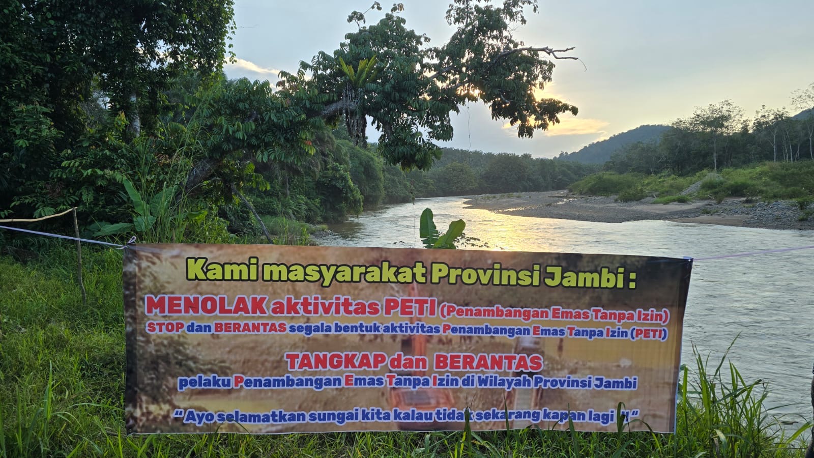 “Kami menolak Pertambangan Emas Tanpa Izin (PETI), stop dan berantas segala bentuk aktivitas PETI. Tangkap dan tindak pelaku yang masih nekat melakukan aktivitas PETI di wilayah Provinsi Jambi. Mari kita selamatkan lingkungan, kalau tidak sekarang kapan lagi,” demikian bunyi imbauan yang terpampang. Rabu (15/4/2025).